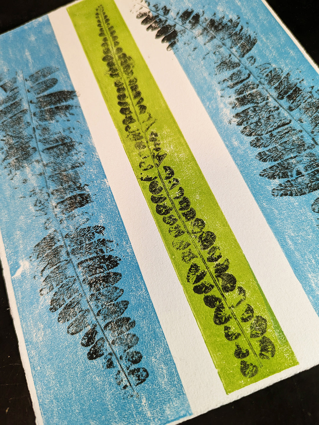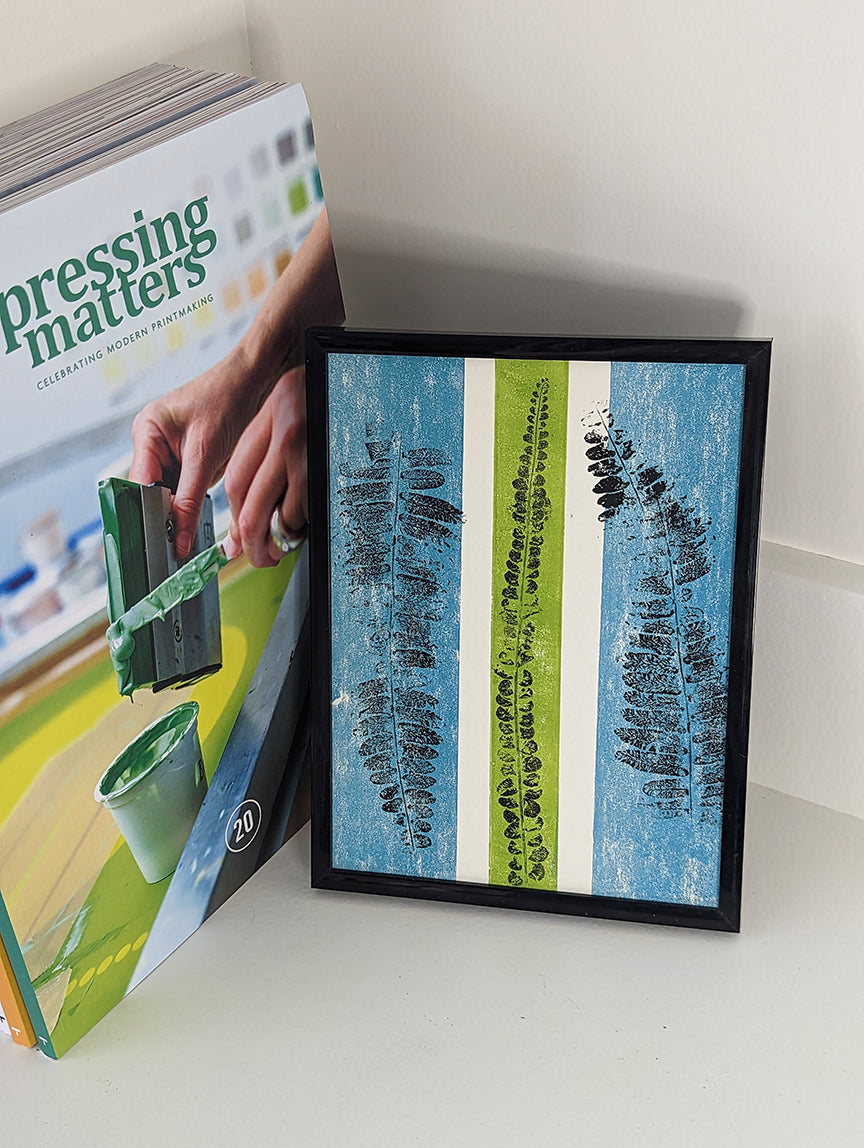 One of a series of monoprints made in anticipation of spring based on mid century style motifs and delicate fern leaflets.