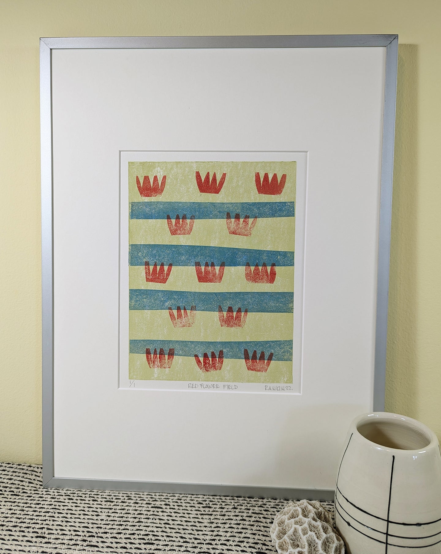 This one of a kind monoprint features stylized red flowers on a striped field.